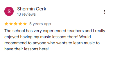 I am really pleased with this music school. All the teachers are there are well trained, and they teach with their heart. Knowing how to play an instrument is different from knowing how to teach. This school has it both. One more thing I really like is all their teachers will give timely feedback to parents on our child's progress and ways to help our child better improve. This is something I do not get from the previous schools.
